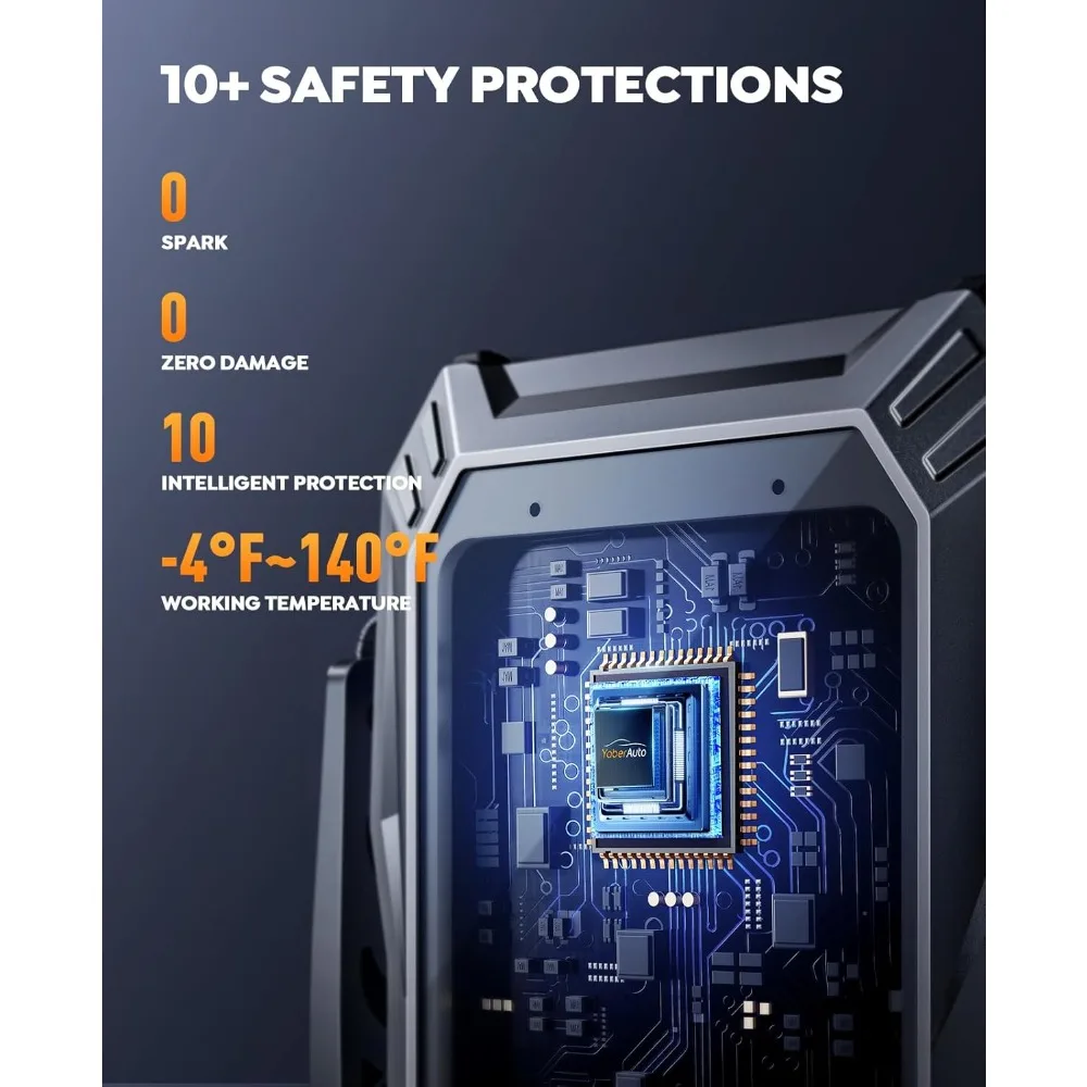 Incluye cables de arranque reforzados y alargados, 10 sistemas de protección, tecnología anti-chispas y protección contra polaridad inversa.