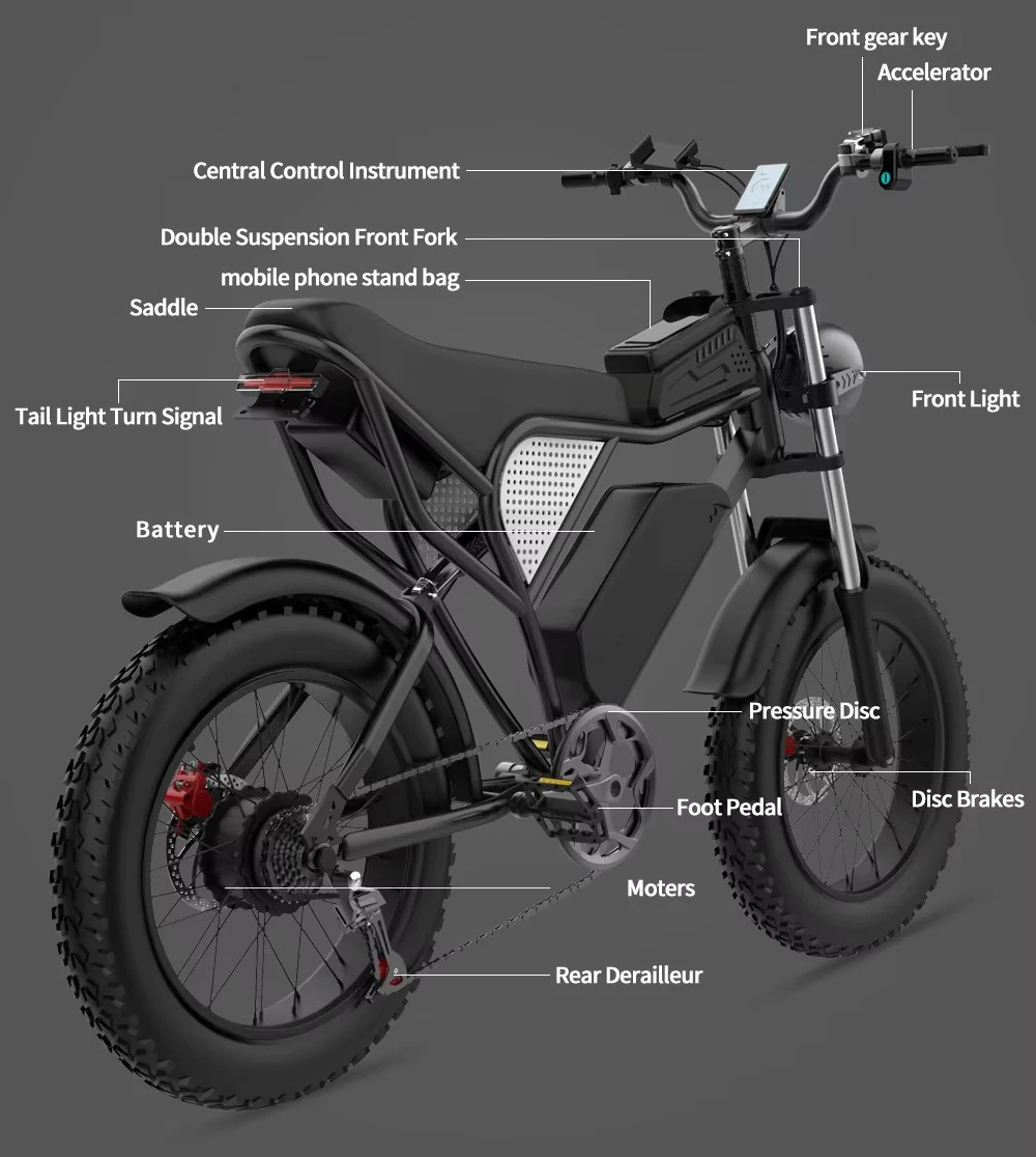 【Motor dual de 2000 W】Las bicicletas eléctricas K20 Pro para adultos cuentan con motores duales sin escobillas con una potencia total de 2000 W, 0-3 segundos hasta 37 mph, que brindan doble potencia para una velocidad máxima de 37 mph y 45° subir colinas.Con el sistema de engranajes Shamano de 7 velocidades, conquistar inclinaciones empinadas nunca ha sido tan fácil, permitiéndole explorar nuevos lugares con confianza.Puede elegir entre usar un modo de motor simple o dual mientras conduce.