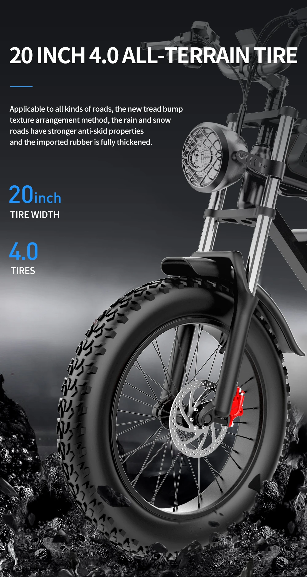 【Pneus grasos y frenos de disco hidráulicos duales】Con sus neumáticos gruesos de 20″ x 4″ resistentes a pinchazos, esta bicicleta eléctrica proporciona un agarre estable en cualquier terreno, incluida la nieve, las playas y las carreteras de montaña en mal estado.Los frenos de doble disco de aceite ofrecen mayor potencia de frenado y un frenado instantáneo preciso, incluso en climas húmedos, garantizando su seguridad en todo momento.