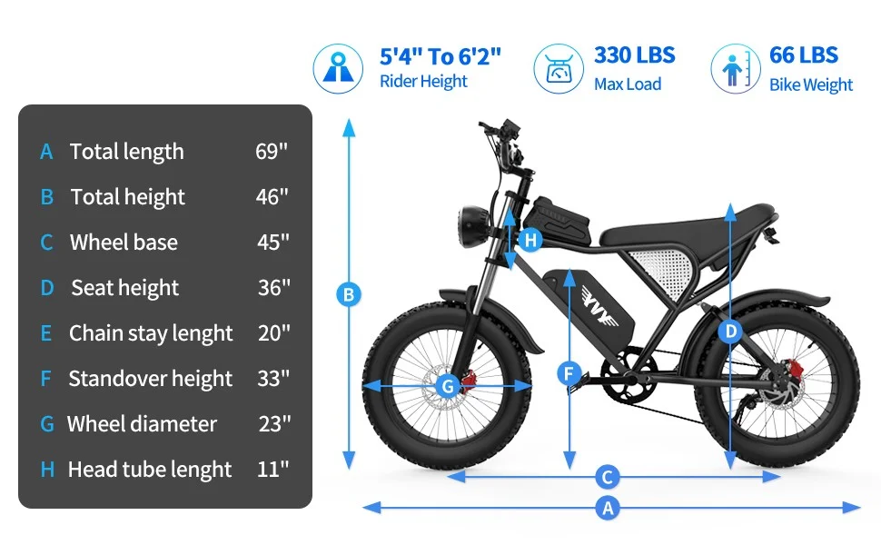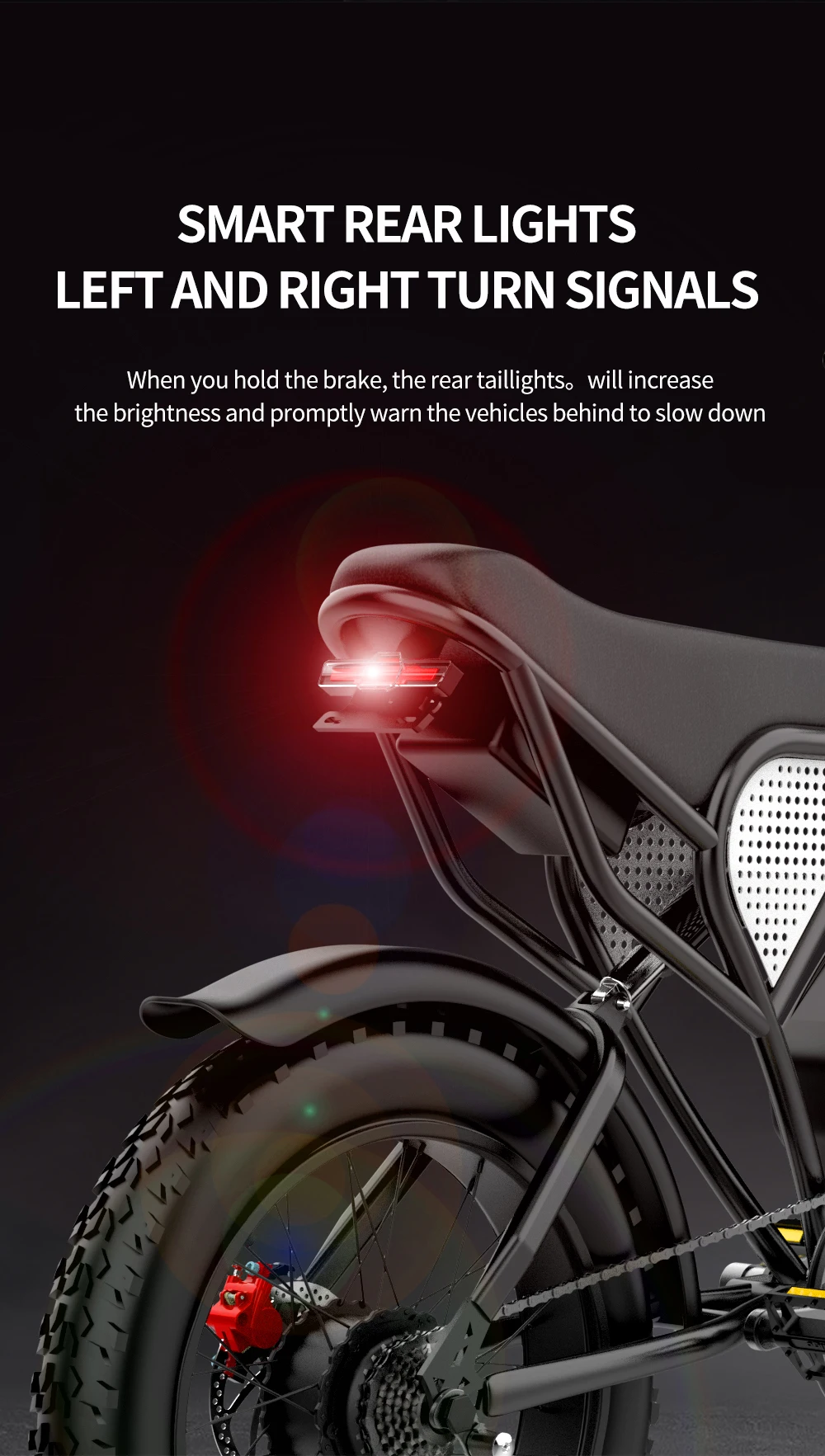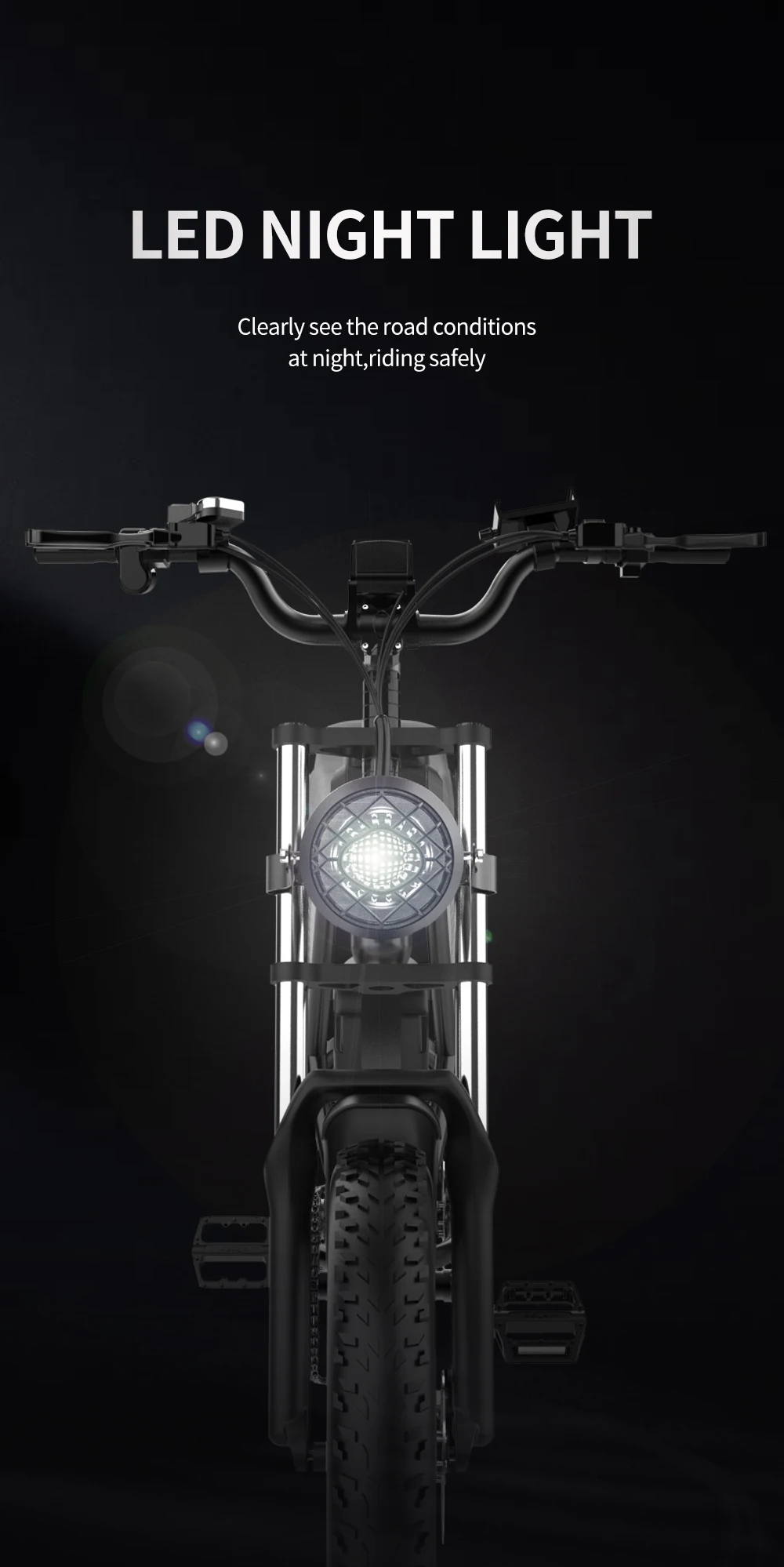 【Estilo único y visión deportiva】Esta bicicleta eléctrica para adultos presenta un diseño único e imaginativo, completa con un fantástico faro para bicicleta para una seguridad óptima durante los paseos nocturnos.El sillín es delicado y suave, con un poste reforzado y un soporte ahuecado que crea una emocionante experiencia de aventura deportiva.Llamarás la atención con esta moto eléctrica para adultos y echarás la envidia de los demás.¡Únete a nosotros y prueba la última tendencia de moda!