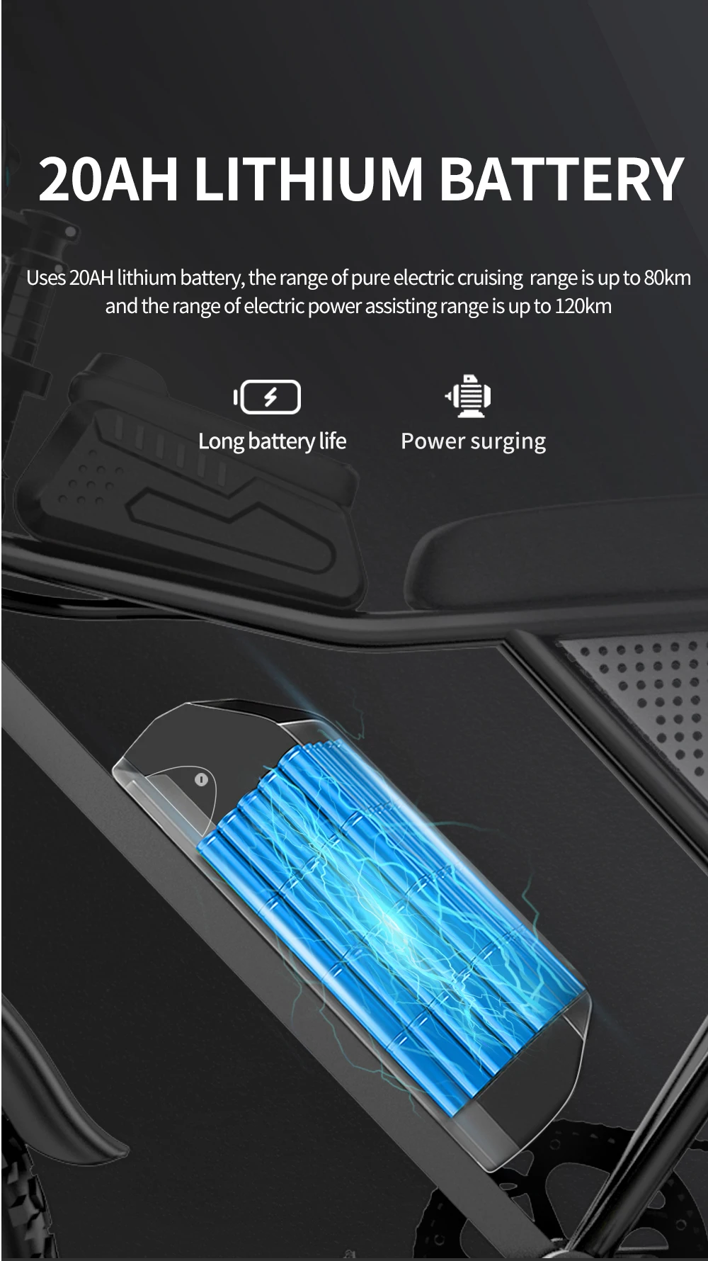 【Batería de alcance ultralargo de 52 V 40 AH】La moto de cross eléctrica K20 pro para adultos está equipada con baterías duales de 52 V 20 Ah (total de 40 Ah), que tienen certificación UL y tienen un sistema BMS.Cada carga puede proporcionar hasta 180 millas de recorrido asistido por pedal, cumpliendo con todas sus expectativas de distancia y permitiéndole ir a cualquier lugar que desee.