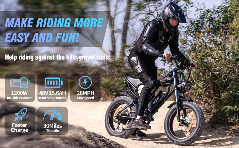 【Conquista montañas】 – La bicicleta eléctrica Risdtar K20MINI cuenta con un potente motor de 1200 W, que le permite alcanzar sin esfuerzo una velocidad máxima de 28 MPH y subir pendientes de hasta 30°.Este motor sin escobillas proporciona un alto par manteniendo un bajo consumo de energía y un funcionamiento silencioso.El sistema de transmisión profesional de 7 velocidades inculce confianza mientras cruces montañas, rocas, ríos y desiertos.