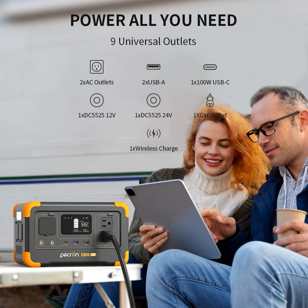 La estación de energía portátil E300LFP incluye 2 tomas AC, 2 puertos USB-A, 1 puerto USB-C (admite entrada y salida), 2 puertos DC5525, 1 toma para coche y 1 cargador inalámbrico de 15W, compatible con prácticamente todos los dispositivos esenciales.[4 FORMAS DE CARGA]