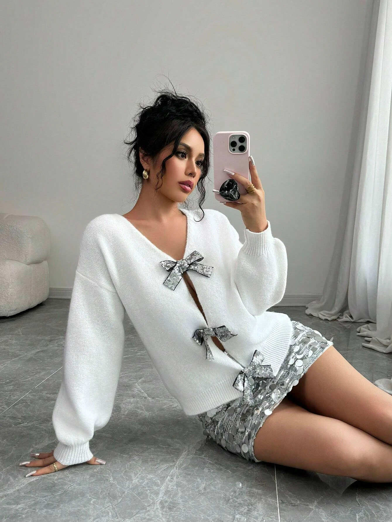 Sé el primero en valorar “Otoño e Invierno nueva moda mujer suéter con lentejuelas lazo Trim suelto manga larga nicho tejido Cardigan”